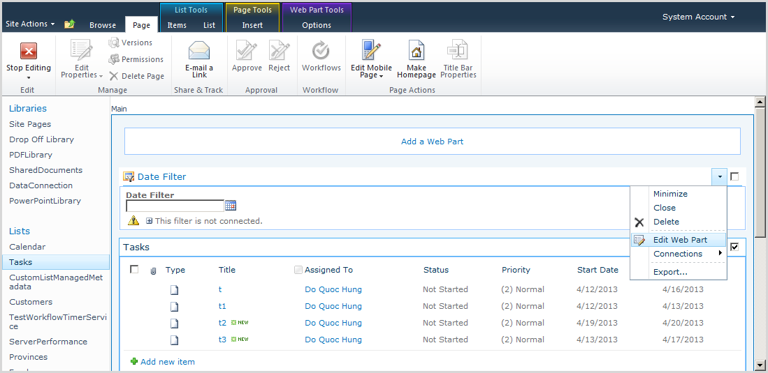 29. Now save the page and open it back up in your browser. It will, by default, show all tasks Start Date in the last seven days thanks to the default setting of the start date filter. Changing these filters will filter the list according to the date ranges set.